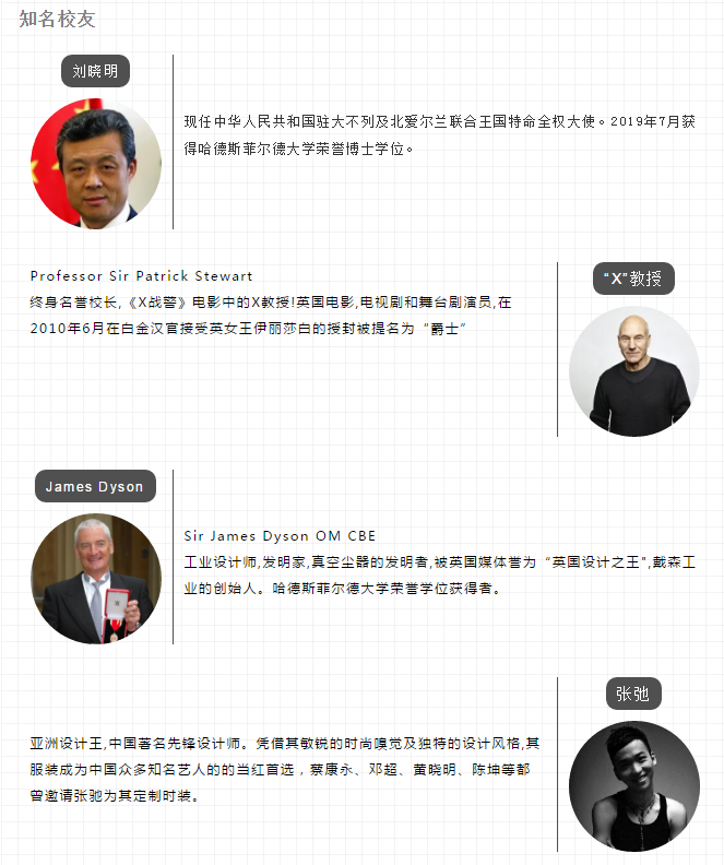 中華人民共和國駐大不列及北愛爾蘭聯合王國特命全權大使劉曉明、戴森工業的創始人 Sr James Dyson OMCBE、3M公司董事長兼 CEOSIR George Buckley、終身名譽校長 Professor Sir Patrick Stewart、Burberry的創意總監兼前 CEOChristopher Bailey MBE、中國著名先鋒設計師張弛等。