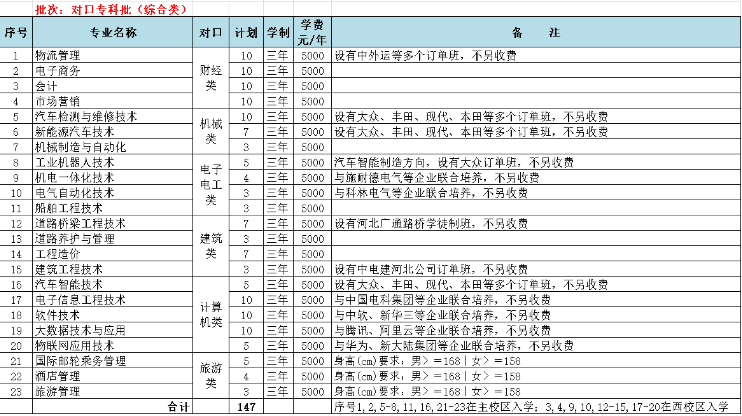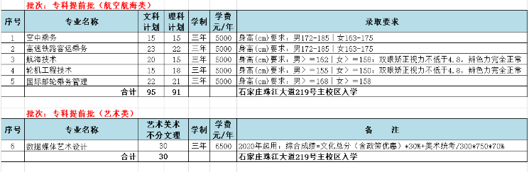 學(xué)院現(xiàn)有在校大學(xué)生14000余名。2020年招生計(jì)劃5300人(不含3+2轉(zhuǎn)段,較往年增加600人),其中河北省高職單招已錄取2350人,省外投放538人,省內(nèi)剩余計(jì)劃2412人(考生填報(bào)志愿學(xué)院代號(hào)0650普通文科考生依據(jù)河北省教育考試院編考試與招生《2020年河北省普通高等學(xué)校招生計(jì)劃》文科含對(duì)口招生冊(cè):文史專科提前批第125頁(yè),專科批第146-147頁(yè),藝術(shù)類(lèi)美術(shù)統(tǒng)考專科提前批第246頁(yè),對(duì)口專科批財(cái)經(jīng)類(lèi)第290頁(yè),對(duì)口專科批機(jī)械類(lèi)第294頁(yè),對(duì)口口專科批電子電工類(lèi)第296頁(yè),對(duì)口專科批建筑類(lèi)第297頁(yè),對(duì)口專科批計(jì)算機(jī)類(lèi)第299頁(yè),對(duì)口專科批旅游類(lèi)第302頁(yè)。理工類(lèi)考生依據(jù)《2020年河北省普通高等學(xué)校招生計(jì)劃》理科招生冊(cè):理工專科提前批第287頁(yè),專科批第311-312頁(yè),藝術(shù)類(lèi)美術(shù)統(tǒng)考專科提前批第416頁(yè))。各批各類(lèi)分專業(yè)招生計(jì)劃如下: