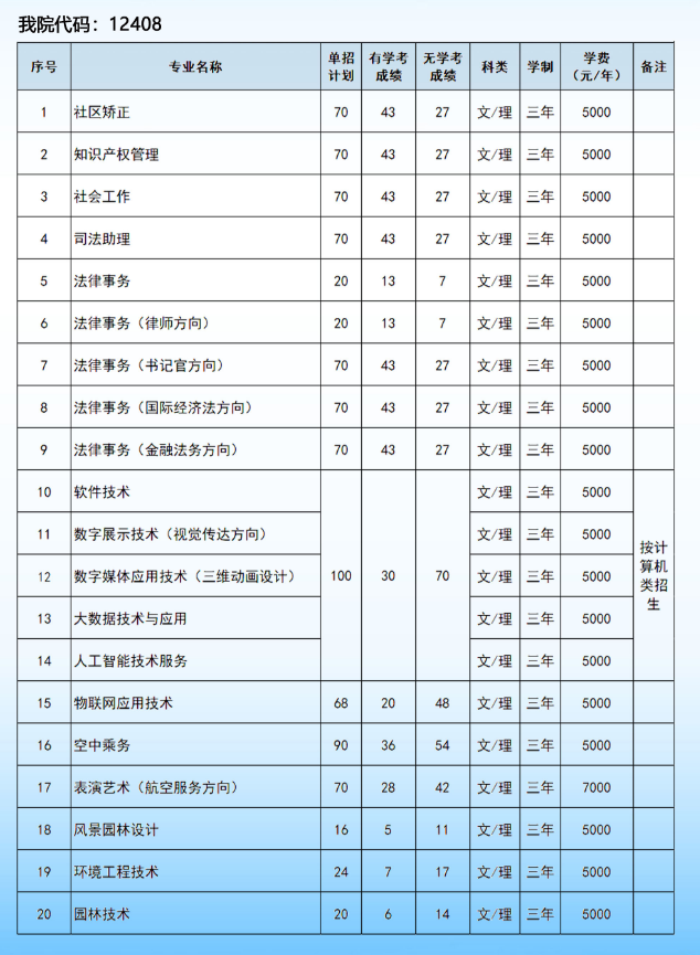 河北政法職業學院2022年單獨考試招生計劃